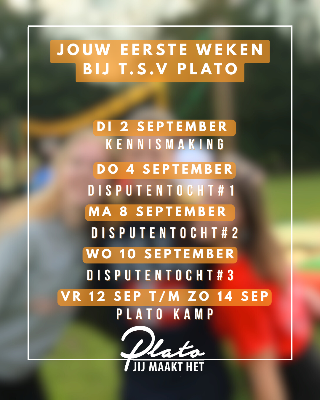 In het weekend van 12, 13 en 14 september staat Plato kamp op de planning waar we samen met veel leden een onvergetelijk weekend neerzetten en het volledig draait om kennismaken en bonding. Dit is geen ontgroeningskamp en gezelligheid staat centraal.